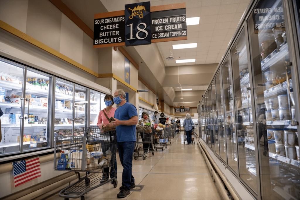 Socially-distanced, masked shoppers wait to pay for their groceries April 16, 2020, inside the commissary at Travis Air Force Base, Calif. (Tech. Sgt. James Hodgman/Air Force)